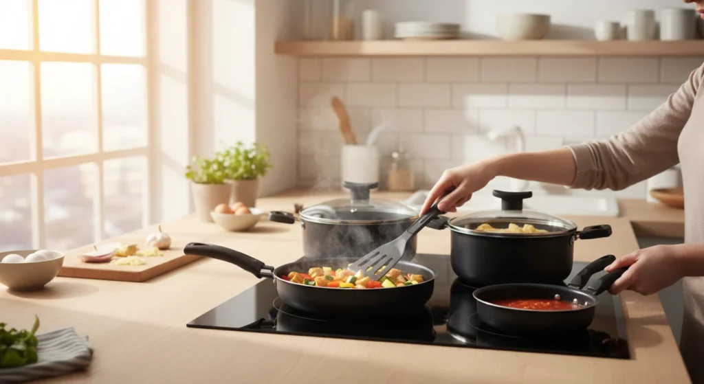 Panelas antiaderentes compatíveis com indução têm bases projetadas para distribuir o calor de forma eficiente, mas a performance ainda depende da qualidade e espessura do material.