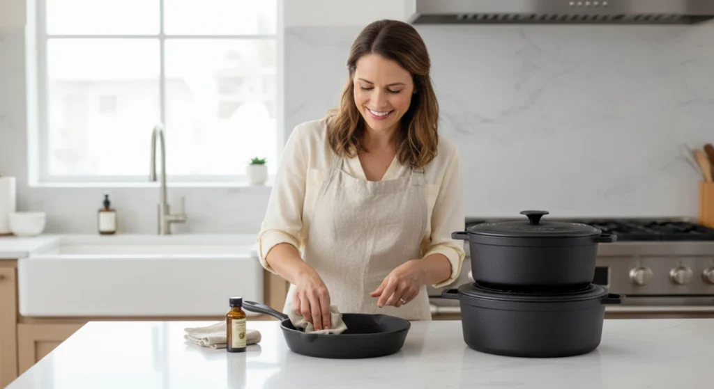 Evite detergentes agressivos, seque bem após lavar, armazene em local seco e faça a cura regularmente para manter a camada protetora.